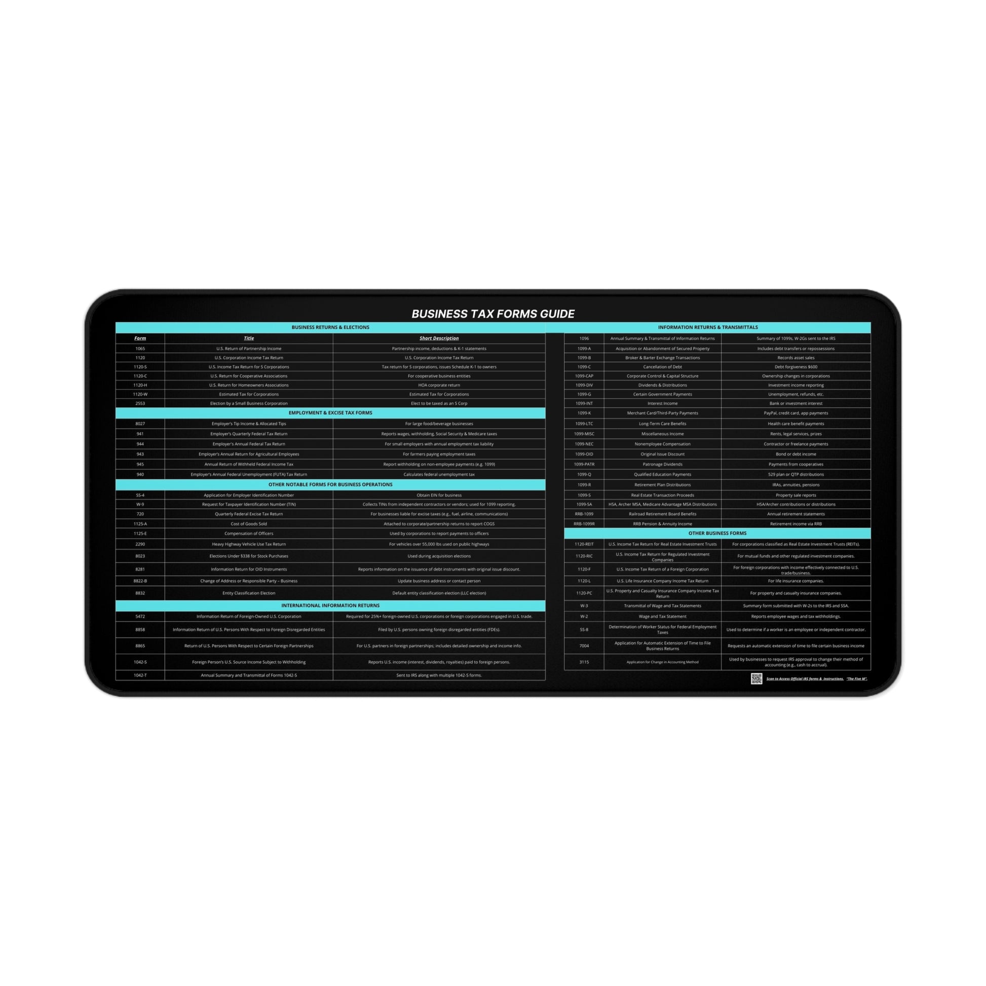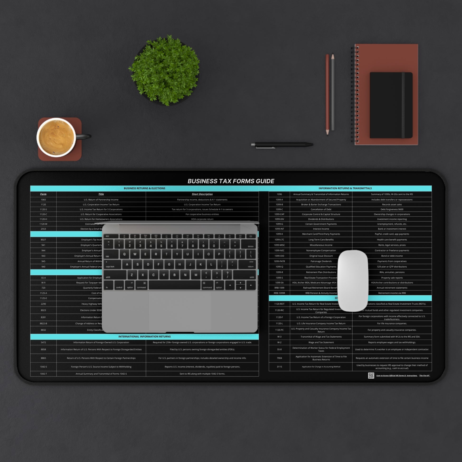Upgrade your desk with the Business Tax Forms Guide Desk Mat — a stylish, quick-reference tool designed to keep your most essential U.S. Business tax forms at your fingertips.
