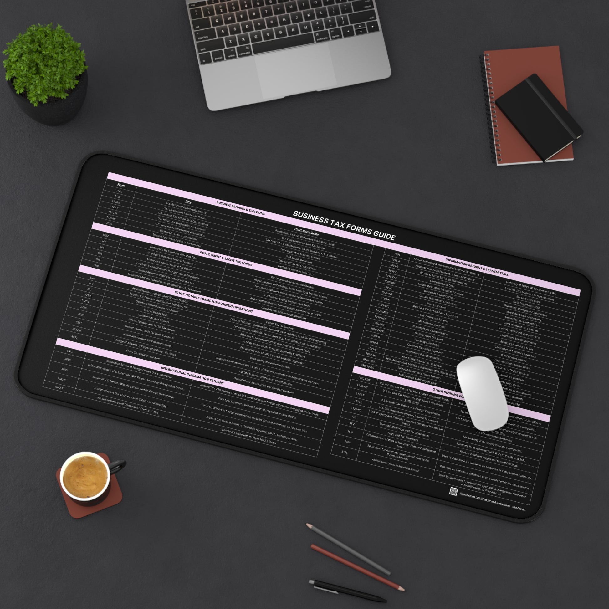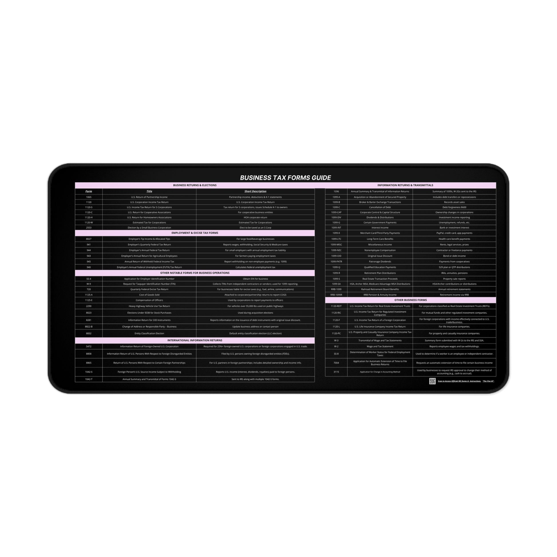 Upgrade your desk with the Business Tax Forms Guide Desk Mat — a stylish, quick-reference tool designed to keep your most essential U.S. Business tax forms at your fingertips.